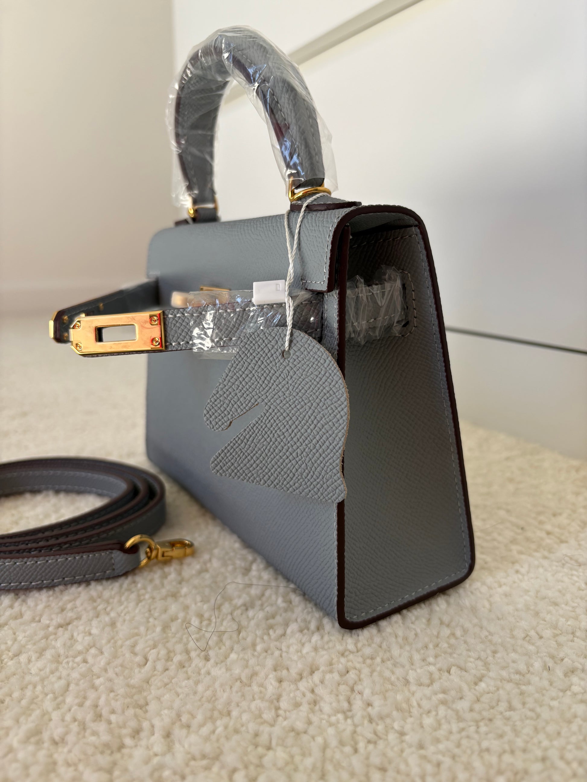 Le Sac Kelly Élégance 19 cm est une pièce chic et intemporelle. Format compact, cuir grainé texturé, poignée rigide et bandoulière ajustable. Livraison rapide depuis la France.